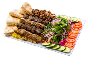 Family Share Platter, featuring lamb souvlaki, chicken souvlaki, chicken shawarma. Served with warm pita bread, lentil rice, Jefran, a fresh selection of vegetables, hummus, garlic tahini, and our signature hot sauce