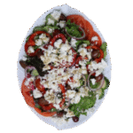 A fresh garden salad with a mix of crisp vegetables, tossed in Greek dressing, and topped with marinated, slow-roasted chicken, feta cheese, and black olives.
