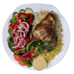 Marinated chicken, infused with a blend of flavorful spices and slowly roasted on a rotating spit, sliced to perfection and served over a bed of rice with hummus and garlic sauce. Accompanied by a fresh selection of vegetables, homemade tahini, and our signature hot sauce.